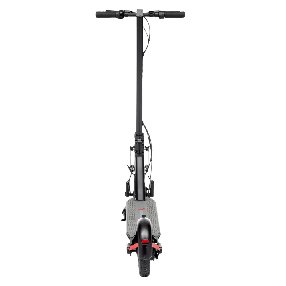 Самокат довольно массивен (23кг), но это позволяет ему быть эффективным при максимальной нагрузке 150кг, а путь до 60 км без подзарядки — очень серьёзный показатель для такого транспорта. Он полноприводный, с прочными колесами, укомплектован надёжными барабанными тормозами, передним фонарём и отражателями на колёсах, стойках и кожухе — производитель позаботился о вашей безопасности в любых ситуациях.