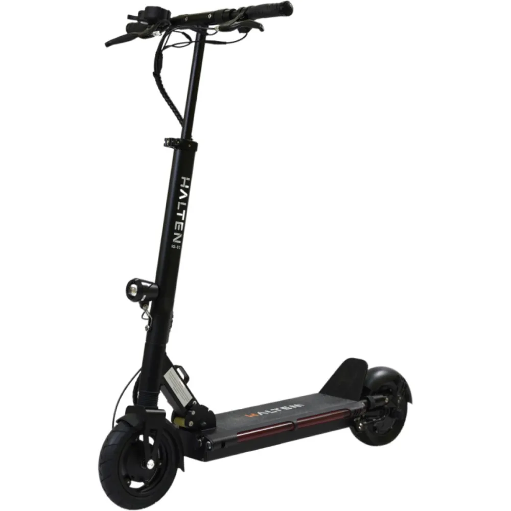 Электросамокат Halten RS-01 оснащен аккумулятором 15 Ah, этого заряда хватает на 35 км пути. Транспорт имеет яркую фару впереди, стоп-сигнал на заднем крыле. Бортовой компьютер позволит контролировать основные показатели, уровень заряда батареи. Складная конструкция уменьшает в сложенном состоянии габариты в два раза. Ручки руля тоже складываются. Его не сложно транспортировать, поместиться в багажник автомобиля, весит электросамокат 16 кг, не трудно переносить в руках.