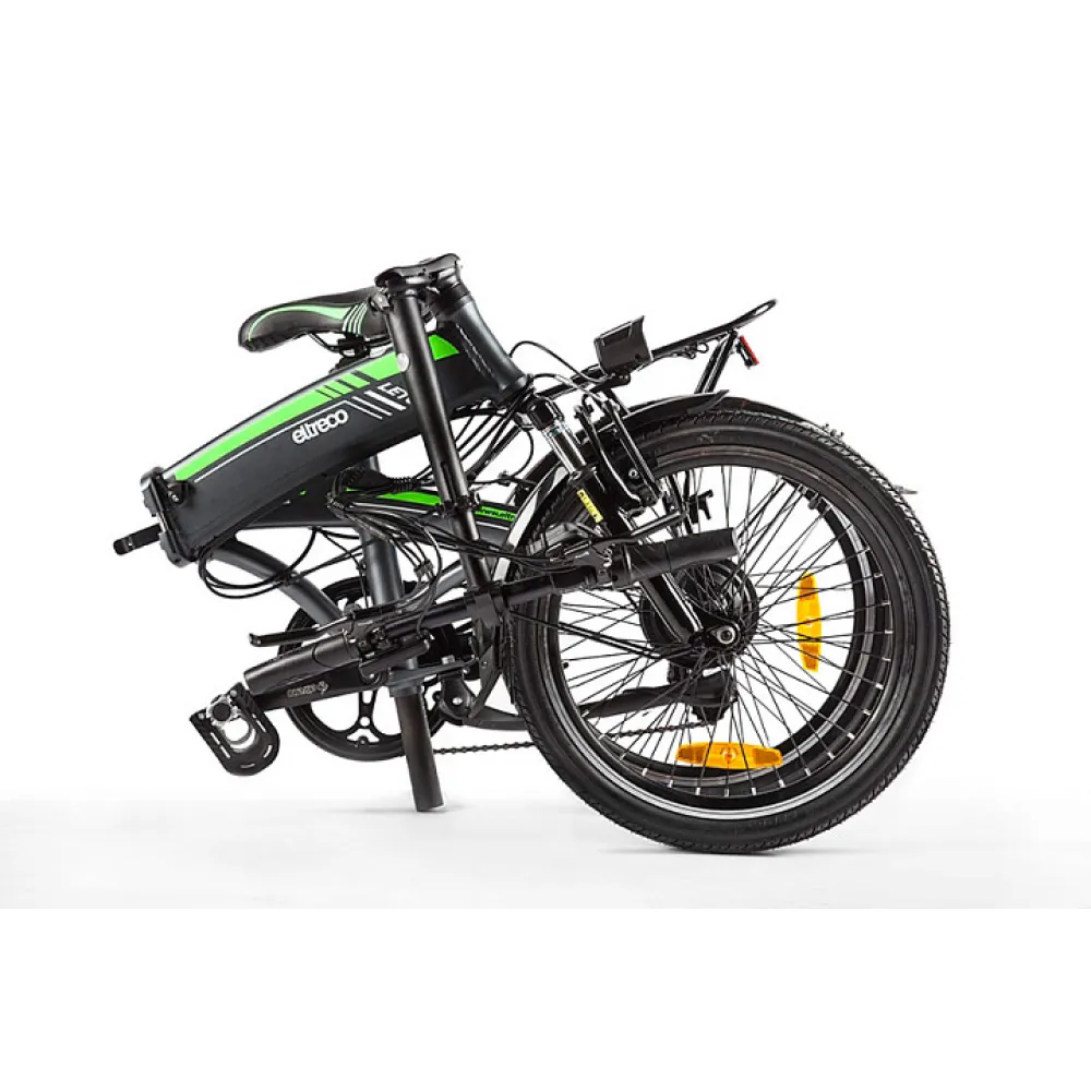 Над задним колесом расположен металлический багажник для надежной фиксации личных вещей. 20-дюймовые колеса повышают маневренность электровелосипеда, а амортизированная подвеска позволяет комфортно преодолевать неровности дороги. Велогибрид Eltreco LETO весит меньше 22 килограммов и имеет складную конструкцию. В сложенном виде данная модель настолько компактна, что без труда поместиться в пассажирском лифте или багажнике автомобиля.