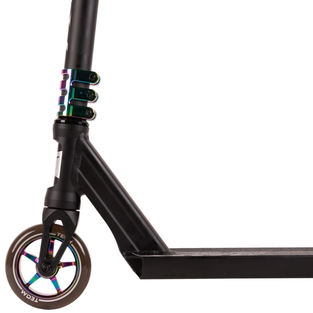 Техника представлена облегченной конструкцией. Весит 3,8 кг. Минималистичная и эргономичная, послушная в управлении. Т-образная часть руля изготовлена из хроммолибденовой стали. Высота руля от зажима и от поверхности составляет 61,5см и 85 см соответственно. Ширина – 54 см и диаметр 34,9 мм удобные для хвата, не провоцируют усталости при длительной эксплуатации техники. Дека размерами 49х12 см изготовлена из высокопрочного алюминиевого сплава, нескользящая, исключает случайные действия в виде соскальзывания стоп. Оснащенность модели конкейвом обеспечивает безопасность, позволяет контролировать собственные действия во время прыжков, выполнения других элементов трюкачества. Накатистые полиуретановые колеса с сердечником 110х24мм оснащены современными подшипниками, обеспечивают максимальный разгон, важный для каждого трюкача. Для заказа трюкового самоката предлагаем связаться с нашим менеджером.